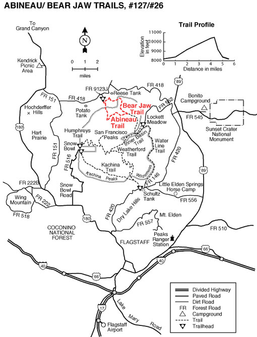 Access: Drive north from Flagstaff on U.S. 180 or U.S. 89. From U.S. 180, the Snowbowl Road and FR 418 and FR 420 provide access. From U. S. 89, FR's 418 and 420 provide access to lower slopes. FR 552 leads to Lockett Meadow and easiest access to the Inner Basin.