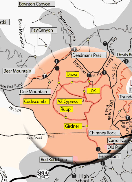 From the junction of Routes 89A and 179, take 179 south 3.5 miles to Back-O'Beyond Road on the right. Go .6 miles to the trailhead parking turnout on the left.